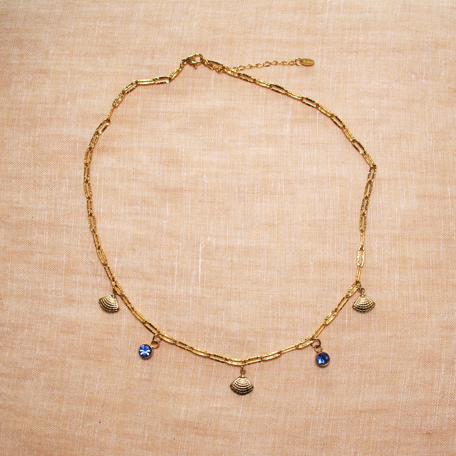 Chaîne paperclip dorée et brillante avec deux pendentifs bleu marines et trois coquillages.